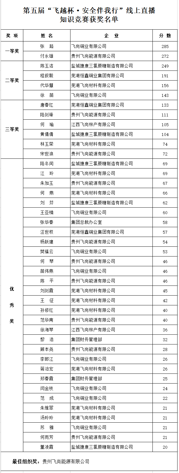 12月28日晚,飞尚集团第五届“飞越杯·安(ān)全伴我行”線(xiàn)上直播知识竞赛正式结束。根据竞赛规则,统计所有(yǒu)参赛者的最终得分(fēn),共59名(míng)参赛者取得竞赛分(fēn)数,其中(zhōng)飞尚铜业有(yǒu)限公(gōng)司张路、贵州飞尚能(néng)源有(yǒu)限公(gōng)司付永雄分(fēn)别以285分(fēn)、272分(fēn)的成绩获得一等奖。贵州飞尚能(néng)源有(yǒu)限公(gōng)司因得分(fēn)总数第一、参赛人数第一,获得最佳组织奖。