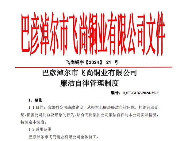 在各成员企业提交的《廉洁自律管理(lǐ)制度》中(zhōng),飞尚铜业有(yǒu)限公(gōng)司、芜湖(hú)飞尚材料有(yǒu)限公(gōng)司不仅逐条列出“廉政行為(wèi)准则”和“廉洁工(gōng)作(zuò)规范”,并对采購(gòu)、销售、财務(wù)、日常工(gōng)作(zuò)及重点工(gōng)作(zuò)程序等提出了具(jù)體(tǐ)要求。