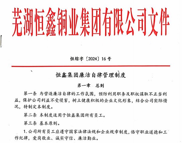 芜湖(hú)恒鑫铜业集团有(yǒu)限公(gōng)司、飞尚贸易有(yǒu)限公(gōng)司以“惩防并举、注重预防”為(wèi)重点,结合“廉洁自律规范”制订了相应的监督实施、违规处理(lǐ)、举报激励措施等。
