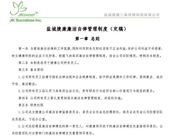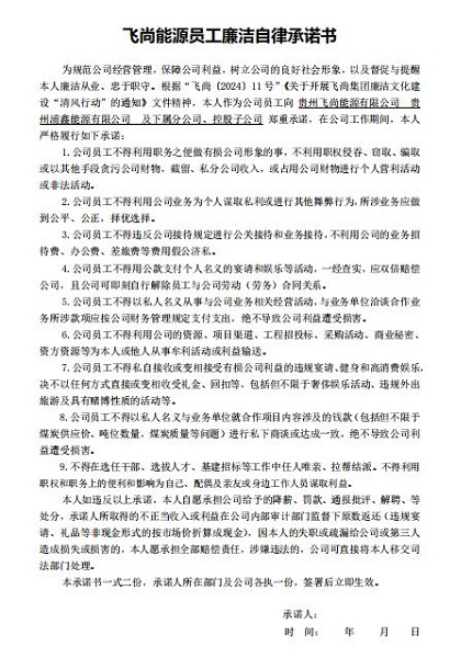 江西飞尚林产(chǎn)有(yǒu)限公(gōng)司、盐城捷康三氯蔗糖制造有(yǒu)限公(gōng)司在建立健全本企业《廉洁自律管理(lǐ)制度》的基础上,结合企业实际,制订了从活动方案到活动内容清单等的一系列制度體(tǐ)系。贵州飞尚能(néng)源有(yǒu)限公(gōng)司还拟订了《员工(gōng)廉洁自律承诺书》,由承诺人签字并交所在部门和公(gōng)司各执一份。