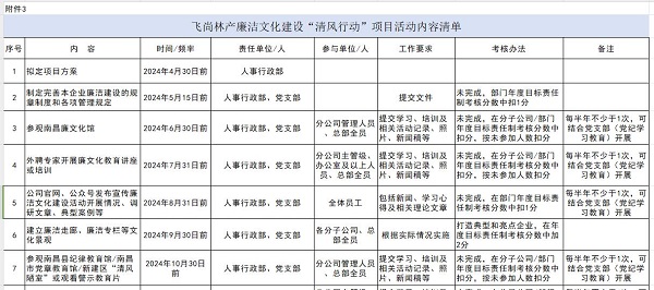 為(wèi)突出制度建设重点,强调可(kě)操作(zuò)性、可(kě)遵循性和一致性,切实发挥制度的规范功能(néng),集团总裁办(bàn)公(gōng)室提前拟订《飞尚集团廉洁自律管理(lǐ)制度》《飞尚集团廉洁文(wén)化建设“清风行动”项目活动内容清单》,并与《通知》一道发布,明确活动目的、工(gōng)作(zuò)原则、活动内容、相关要求等。同时,要求各成员企业从实际出发,量力而為(wèi),務(wù)求实效,坚持群众路線(xiàn),加强调查研究,有(yǒu)针对性建立健全廉洁工(gōng)作(zuò)制度,加强制度的可(kě)操作(zuò)性和适用(yòng)性。